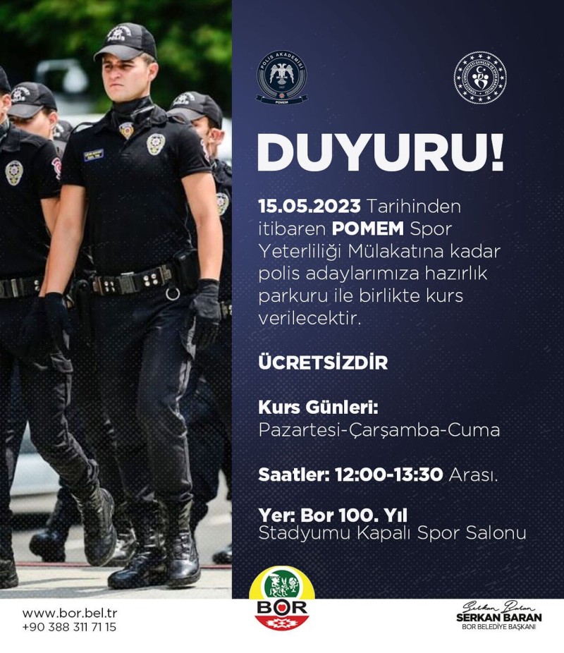 Bor Belediye Başkanı Serkan Baran konuyla ilgili açıklamasında Polis Meslek Eğitim Merkezi (POMEM) sınavlarına hazırlanan polis adaylarımıza haftanın üç günü kurs vereceklerini ve bu kursun hiçbir ücret alınmadan verileceğini söyledi. Kursun, Bor 100’ncü Yıl Stadyumu Kapalı Spor Salonunda Pazartesi, Çarşamba ve Cuma günleri 12.00-13.30 saatleri arasında verileceği duyuruldu.